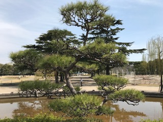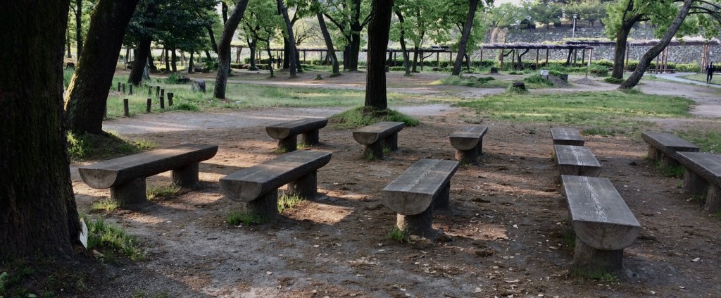 Eyeing off these benches, since I first made their acquaintance some weeks ago. Clearly a church of sorts, beneath a beautiful tree, with a castle peering over, benevolent, at least for now. Today I took some poetry, a scarf, a timer. I sat on the third bench from the front, this side of the tree. I reminded myself of my self. Listened. Remembered. I kept my eyes closed, despite the commotion developing around me and my pew. Although, inevitably, the clatter and chatter seemed loud enough and intentional enough to warrant a peek. My need for deep attention was in conflict with the needs of the group buzzing about me who had in a short time placed cushions on the pews and set up many numbered flags about the park to commence a game which looked like something between golf and croquet (gateball perhaps?). I got up, humbly bowed and uttered ohayo gozaimasu to a small indifferent crowd.
