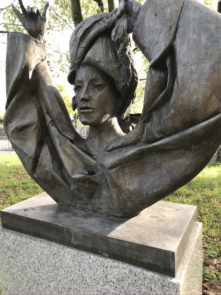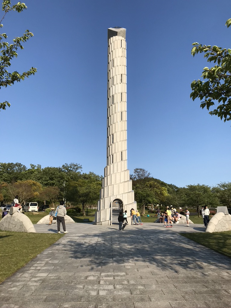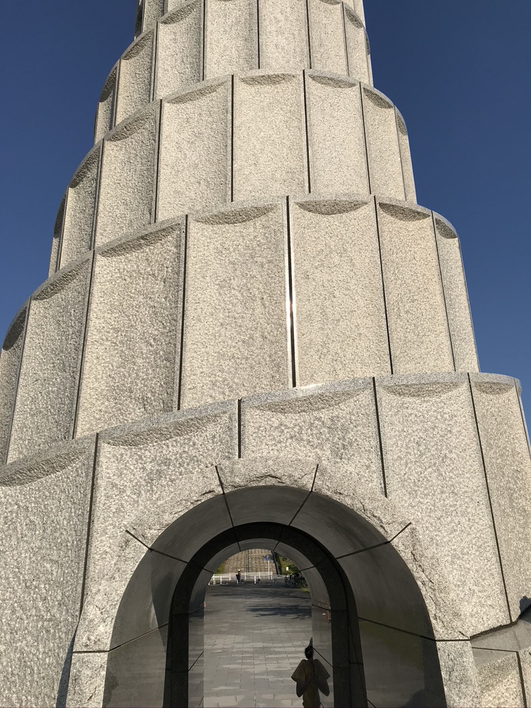 Heading out yesterday on an excursion curated by Cameron, we found ourselves at a large cemetery, the Heiwa Koen Cemetery, both a Peace Park and a graveyard. It is a beautiful, quiet space. Extensive and inviting, with tombs, shrines, statues and monuments spread across an undulating landscape. I was nervous to take photos, not sure of the protocol. So just stuck with the edifice below: Niji-no-toh, the rainbow tower, that produces a rainbow effect on the day of the spring and autumn equinoxes.