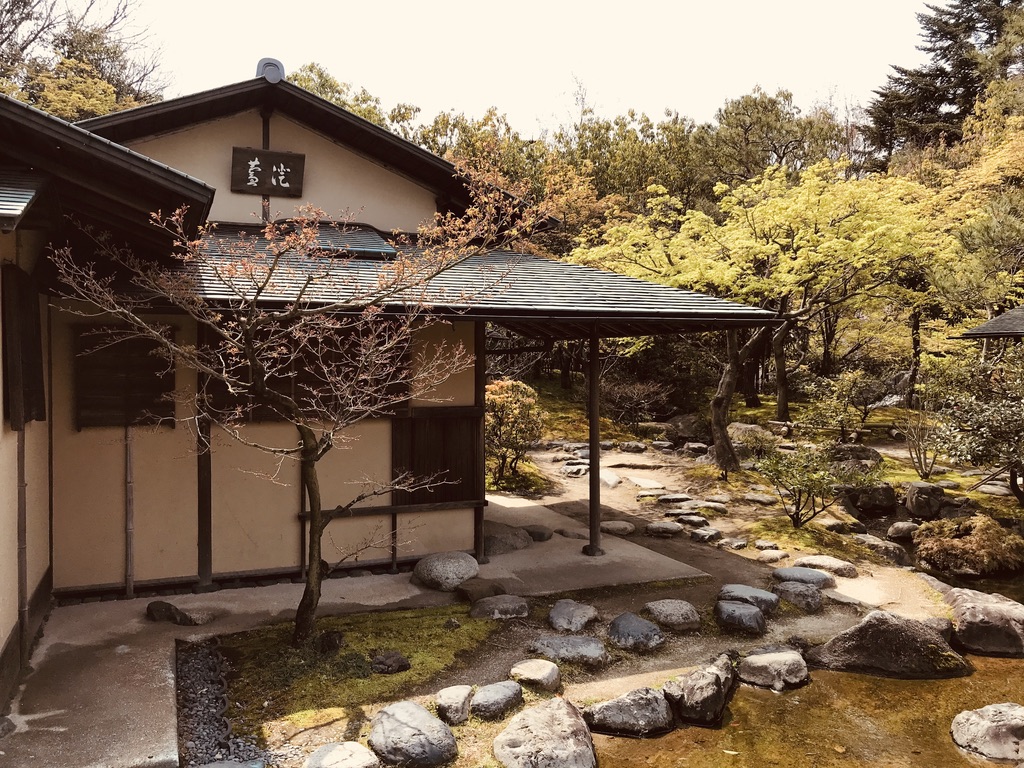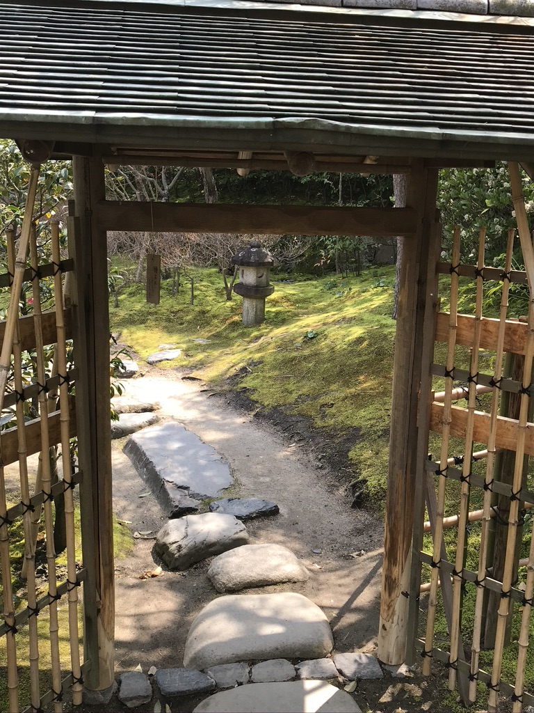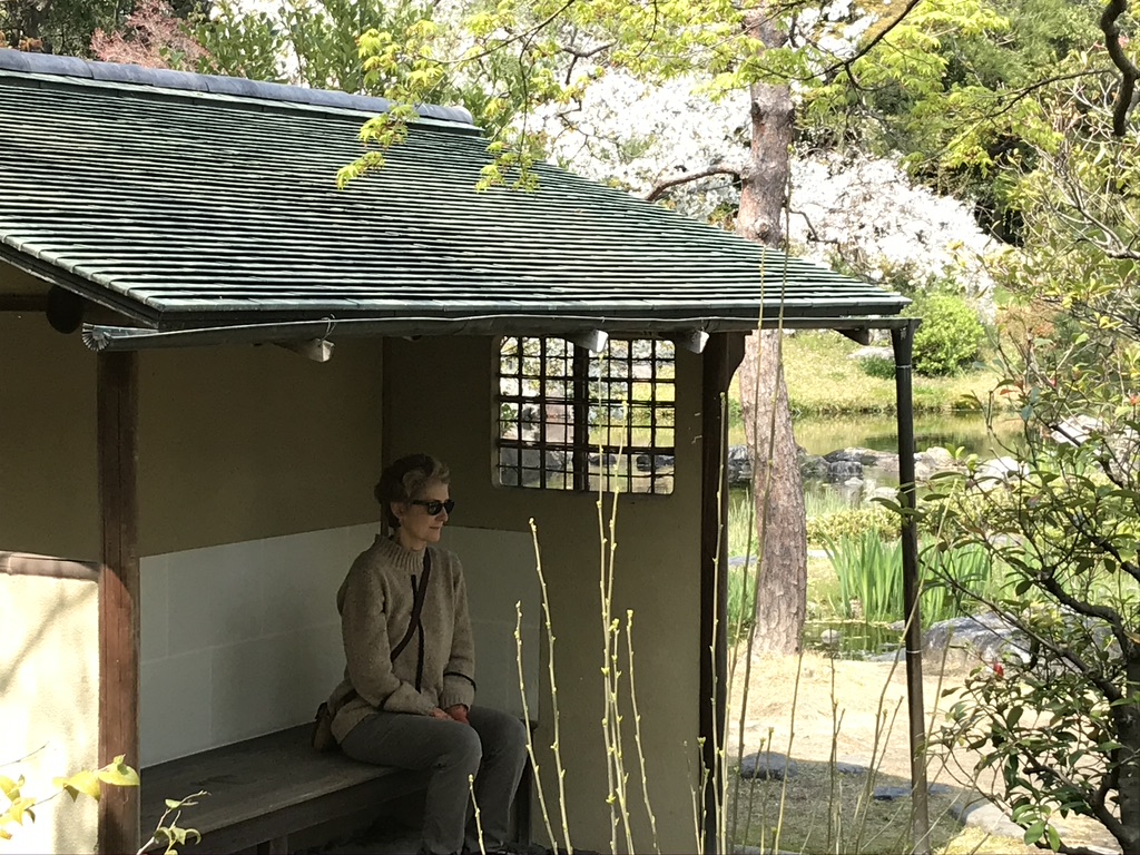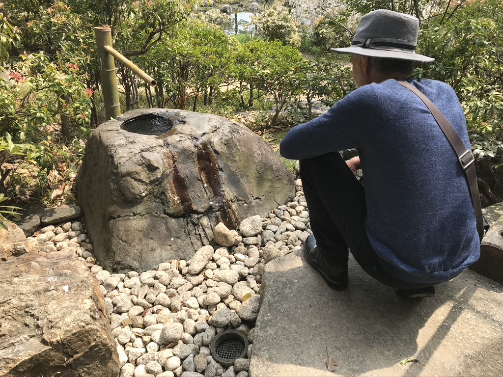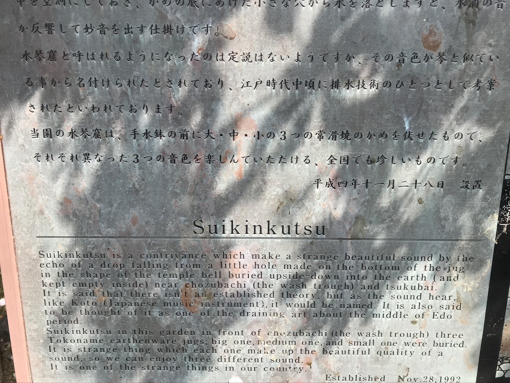 And this, Suikinkutsu, if you are able to read the words inscribed on the plaque in the photograph above you will see it is a “contrivance which make a strange beautiful sound by the echo of a drop falling from a little hole made on the bottom of the jug in the shape of the temple bell buried upside down into the earth…….”[as seen on the plaque in the second photograph]. I could not hear a single thing until I edged closer. Brought my good ear lower to the ground and heard something. And then heard more somethings. Goodness. A strange and beautiful sound indeed. I hope the audio recording I took and attempted to post on this blog can be heard by you too (the bells don’t sound immediately, you will have to persevere for at least 15 seconds to hear something other than the sound of water and crows and me fumbling with my iphone). Cameron is sitting in front of the suikinkutsu. I had to remove my ear from the ground to take the photograph.